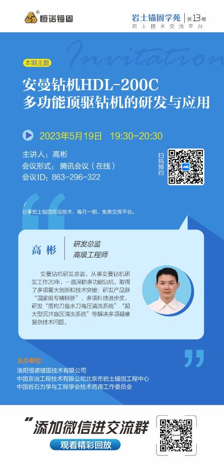 巖土錨固學苑將于2023年5月19日(周五)19:30-20:30舉辦第13期,本期主題:安曼鉆機HDL-200C多功能頂驅(qū)鉆機的研發(fā)與應(yīng)用,歡迎廣大巖土錨固領(lǐng)域愛好者參與交流。