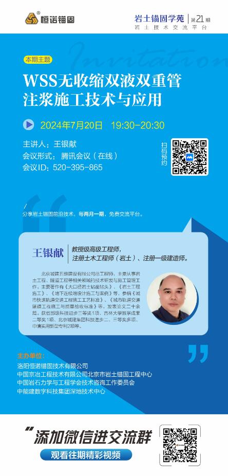 巖土錨固學(xué)苑將于2024年7月20日(周六)19:30-20:30舉辦第21期,本期主題:WSS無收縮雙液雙重管注漿施工技術(shù)與應(yīng)用,歡迎廣大巖土錨固領(lǐng)域愛好者參與交流。