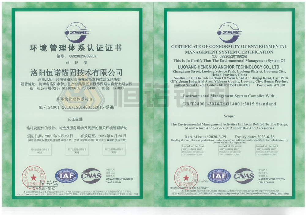 發(fā)布日期:2020-05-31 17:202020年6月29日,洛陽(yáng)恒諾錨固技術(shù)有限公司順利通過(guò)ISO14001:2015“環(huán)境管理體系認(rèn)證”及ISO45001:2018“職業(yè)健康安全管理體系認(rèn)證”。ISO14001環(huán)境管理體系認(rèn)證,是指依據(jù)I......