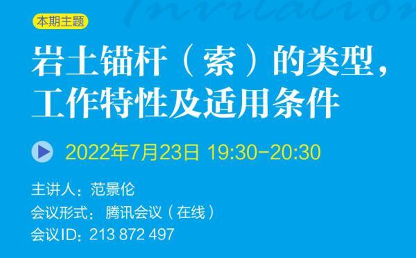 巖土錨固學(xué)苑將于2022年7月23日(周六)19:30-20:30舉辦第3期,本期主題:巖土錨桿(索)的類(lèi)型,工作特性及適用條件,歡迎廣大巖土錨固領(lǐng)域愛(ài)好者參與交流。...