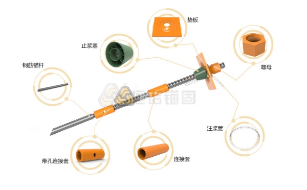 自鉆式錨桿是一種集鉆孔、注漿與錨固功能于一體的高效支護(hù)形式。其核心特點(diǎn)在于,施工時以中空桿體作為鉆桿直接鉆進(jìn),并可同步通過桿體內(nèi)部通道灌注漿液。成孔后,中空桿體無需拔出,直接作為錨桿留在巖體中,最終形成全長粘結(jié)型錨固體。該施工工藝有效避免了復(fù)雜地質(zhì)條件下的塌孔風(fēng)險,具有施工快捷、適應(yīng)性強(qiáng)等突出優(yōu)點(diǎn),尤其適用于破碎巖層和軟弱圍巖砂卵石地段支護(hù)工程。