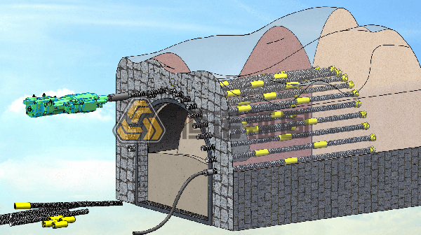 超前錨桿是一種結構簡單、應用廣泛的超前支護方法。其做法是沿隧道開挖輪廓線,將鋼筋錨桿以一定傾角打入開挖面前方的圍巖中。錨桿后端固定在穩(wěn)定巖層內,前端則伸入開挖面區(qū),從而預先對圍巖形成支護作用。